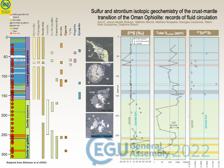 How to cite: Jesus, A. P., Strauss, H., Benoit, M., Rospabé, M., Ceuleneer, G., Gonçalves, M. A., and Bosch, D.: Sulfur and strontium isotopic geochemistry of the crust-mantle transition of the Oman Ophiolite: records of fluid circulation, EGU General Assembly 2022, Vienna, Austria, 23–27 May 2022, EGU22-10618, https://doi.org/10.5194/egusphere-egu22-10618, 2022.