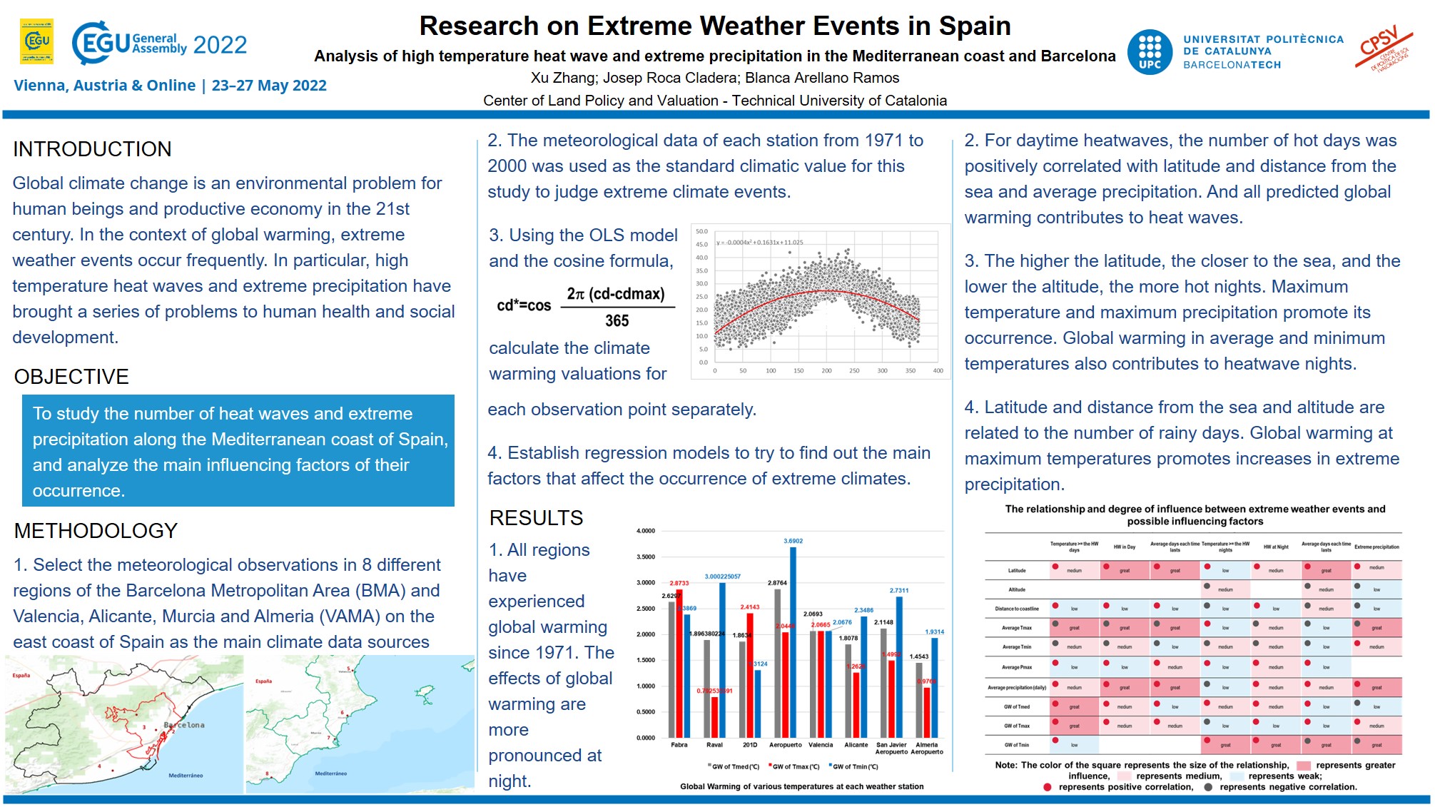 How to cite: Zhang, X., Roca Cladera, J., and Arellano Ramos, B.: Research on Extreme Weather Events in Spain - Analysis of high temperature heat wave and extreme precipitation in the Mediterranean Coast of Spain and Barcelona, EGU General Assembly 2022, Vienna, Austria, 23–27 May 2022, EGU22-6438, https://doi.org/10.5194/egusphere-egu22-6438, 2022.