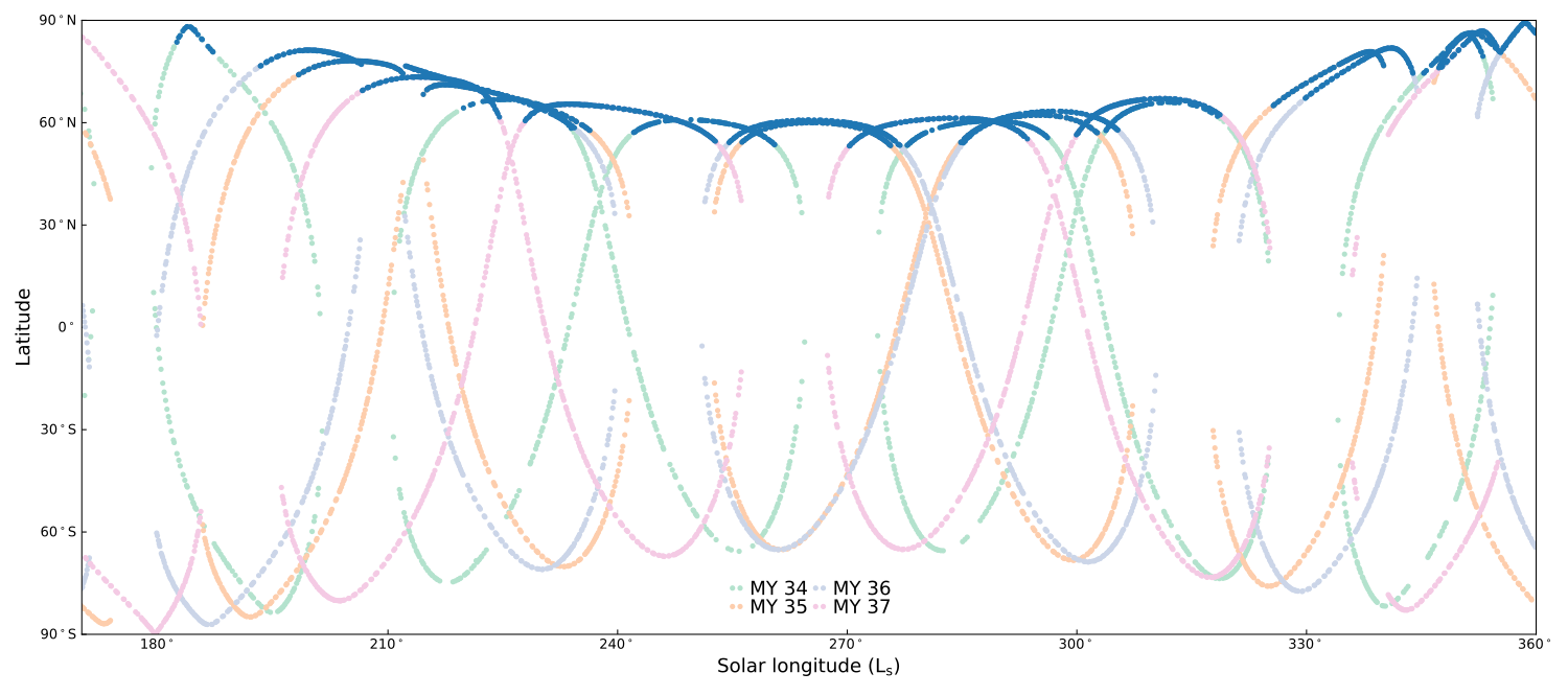 The Atmospheric Chemistry Suite (ACS) mid-infrared channel (MIR) on the ExoMars Trace Gas Orbiter (TGO; 4) operates in solar occultation mode in which the Sun is used as a light source when the atmosphere lies between the Sun and TGO. The tangent point locations of ACS MIR observation necessarily lie on the solar terminator on Mars. At the poles when either polar night or polar day are experienced, there is no terminator, and solar occultations are restricted to outside such a region. The latitudinal distribution of ACS MIR solar occultations during the north polar fall and winter over four Mars years (MYs) is shown in Fig. 1. The furthest northern extent of observations occurs at the equinoxes, and falling northern boundary is seen between, as the north pole points further away from the Sun (similarly in the south, where it is polar day).