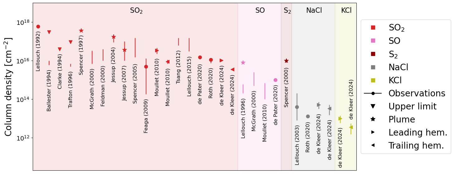 Jupiter's satellite Io, the innermost Galilean moon, is subject to extreme tidal forces, making it the most volcanically active body in the Solar System. Io's tenuous atmosphere consists primarily of SO2, with the expected main source being the sublimation of SO2 surface frost. Furthermore, volcanoes and lava lakes can strongly impact the atmosphere and dominate locally [1]. Next to SO2, dissociation products (e.g., SO, S, O), along with compounds from volcanic eruptions, such as S2, NaCl, and KCl, have been detected in Io’s atmosphere.