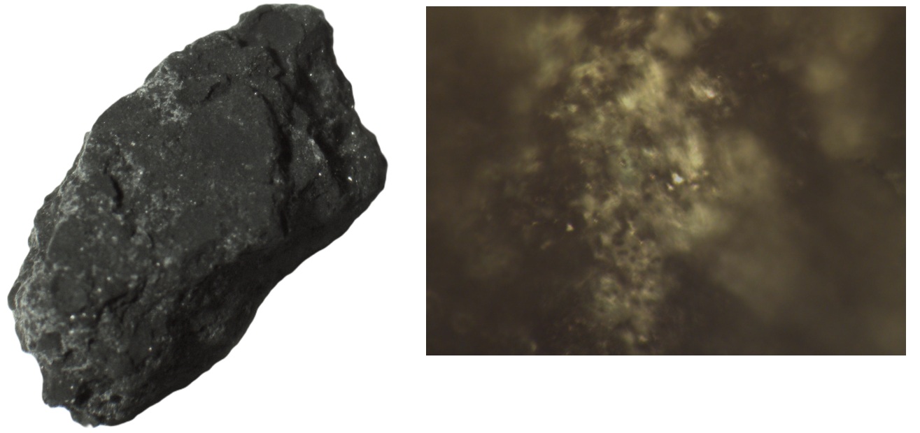 Figure 1. (Left) Microscope image (0.75X) of the Bennu chip OREX-800084-0. The length of the chip is about 9 mm across. (Right) An image (300x200 µm) of a bright clast in the Bennu sample that was spectrally analysed.