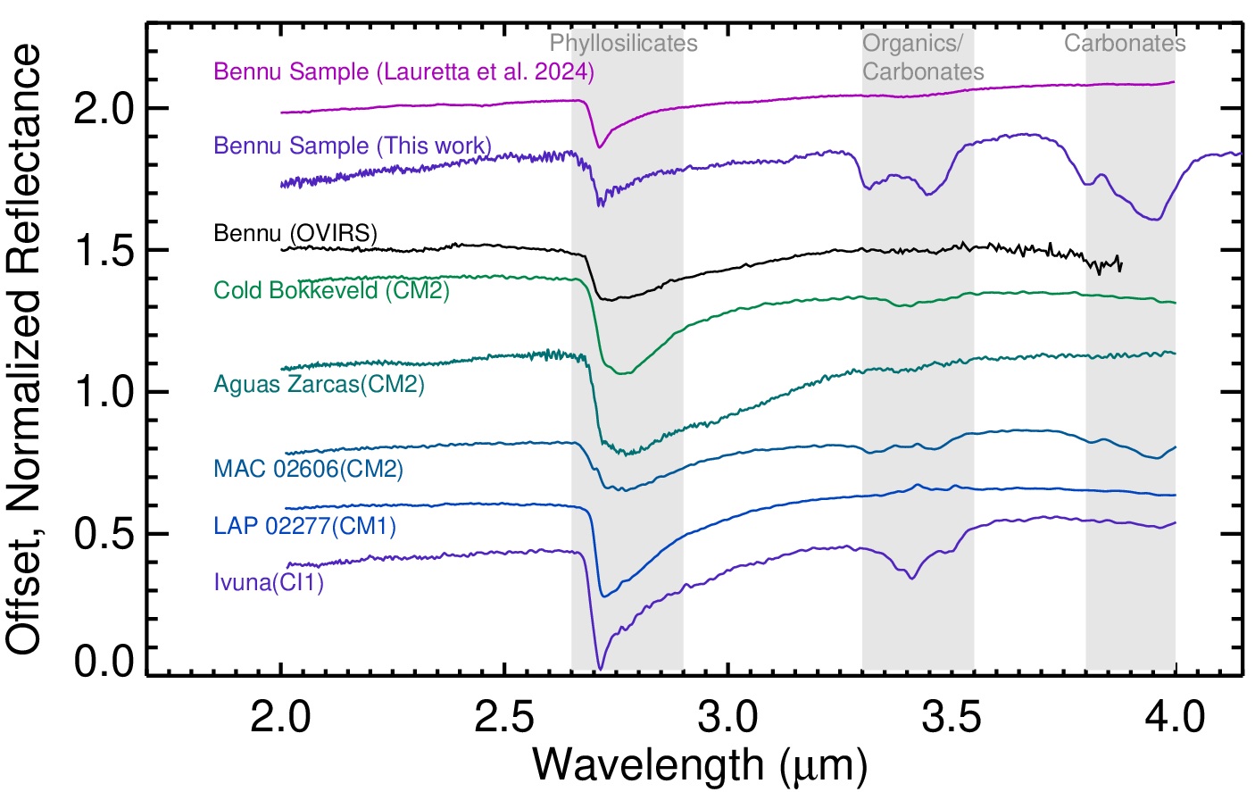 Figure 2 presents the measured infrared reflectance spectrum of one of the bright spots shown in Figure 1 (right) from ~ 2 to 4 μm. The longer wavelength data are still being analyzed. The spectrum confirms a narrow absorption band centered at ~ 2.72 μm, which is indicative of Mg-rich serpentine and clay minerals. This absorption feature aligns with those found in CM chondrites, such as LAP 02277, and CI chondrites, like Ivuna. This observation suggests that both Bennu and these meteorites likely experienced similar aqueous alteration environments.