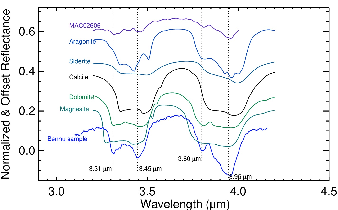 Organic features due to carbon-hydrogen (C-H) bond stretching typically overlap with one of the carbonate doublets at ~3.4 μm. However, the feature observed in the Bennu sample at ~3.4 μm indicates the presence of pure carbonates with no organics (Fig. 3, lower). In this talk, we will discuss additional spectra of the Bennu sample and their implications for constraining the evolution of carbon reservoirs during secondary processing events (e.g., aqueous alteration) experienced by asteroid Bennu.