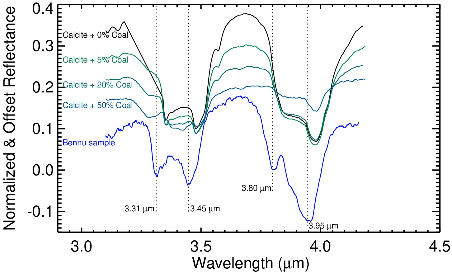 Figure 3. (Upper) The 3-to-4-μm region of the spectrum of the Bennu sample is compared with those of various carbonaceous phases compiled from the RELAB spectral library. The carbonate feature observed in Bennu is consistent with dolomite and inconsistent with calcite. (Lower) The spectrum of our Bennu sample is plotted alongside the spectra of calcite and coal mixtures (Hancock et al., 2025).