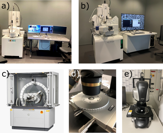 Figure 1. a). JEOL FEG-SEM. b). JEOL FE-EMPA. c). Malvern Panalytical XRD. d) Brucker FTIR microscope. e) Keyence digital 3D microscope.