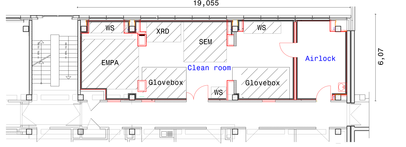 The FE-EMPA is equipped with 5 wavelength dispersive x-ray spectrometers (WDS) with the interchangeable crystals TAPL/J, LDE1L/2, PETL/J/H and LIF/L/H, enabling a comprehensive coverage of elements and increased flexibility and efficiency in elemental mapping. In addition, it has an energy dispersive x-ray spectrometer (EDS) for rapid mapping and identification of target areas. The SEM is equipped with an EDS detector for rapid compositional mapping of samples. An additional backscattered electron (BSE) detector enables detailed topographical measurements. The XRD has Bragg-Brentano geometry, which can be switched to parallel beam geometry, and a Cu kα source with a 1Der detector. The sample form is flexible, from powders to larger solid objects. Localised µ-XRD analyses can be performed by reducing the beam spot size down to 140µm. All three devices have dedicated sealed transport vessels allowing sample transfer from the glovebox environment to the instruments under a controlled atmosphere. Two glove boxes will be acquired, for sample storage and for sample manipulation. Both glove boxes will be N2-purged and have an ISO 5 particle contamination requirement with active O2 and H2O monitoring. Vacuum compatible surface requirements and materials will be used to reduce contamination sources. Each glove box will have space for up to two users and will be equipped with a viewing port for sample documentation with a camera or microscope. The layout of the instruments and gloveboxes in the laboratory is shown in Figure 2.