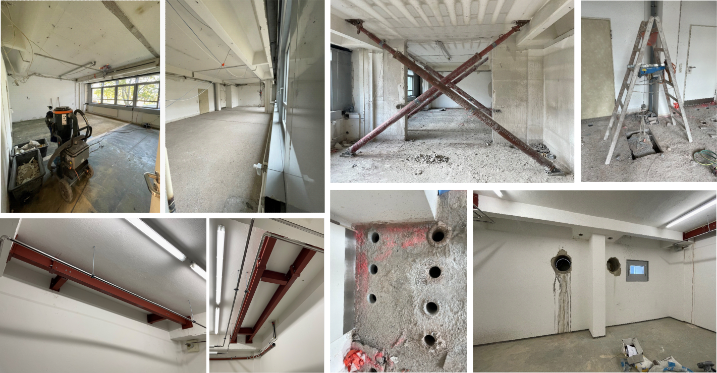 Figure 3 The current status of the building SAL progress (April 2025). The rooms have been stripped back, the partitioning wall has been removed, the necessary reinforcements and openings for the air purification system have been made, and the openings for conduits for the technical supplies have been made.