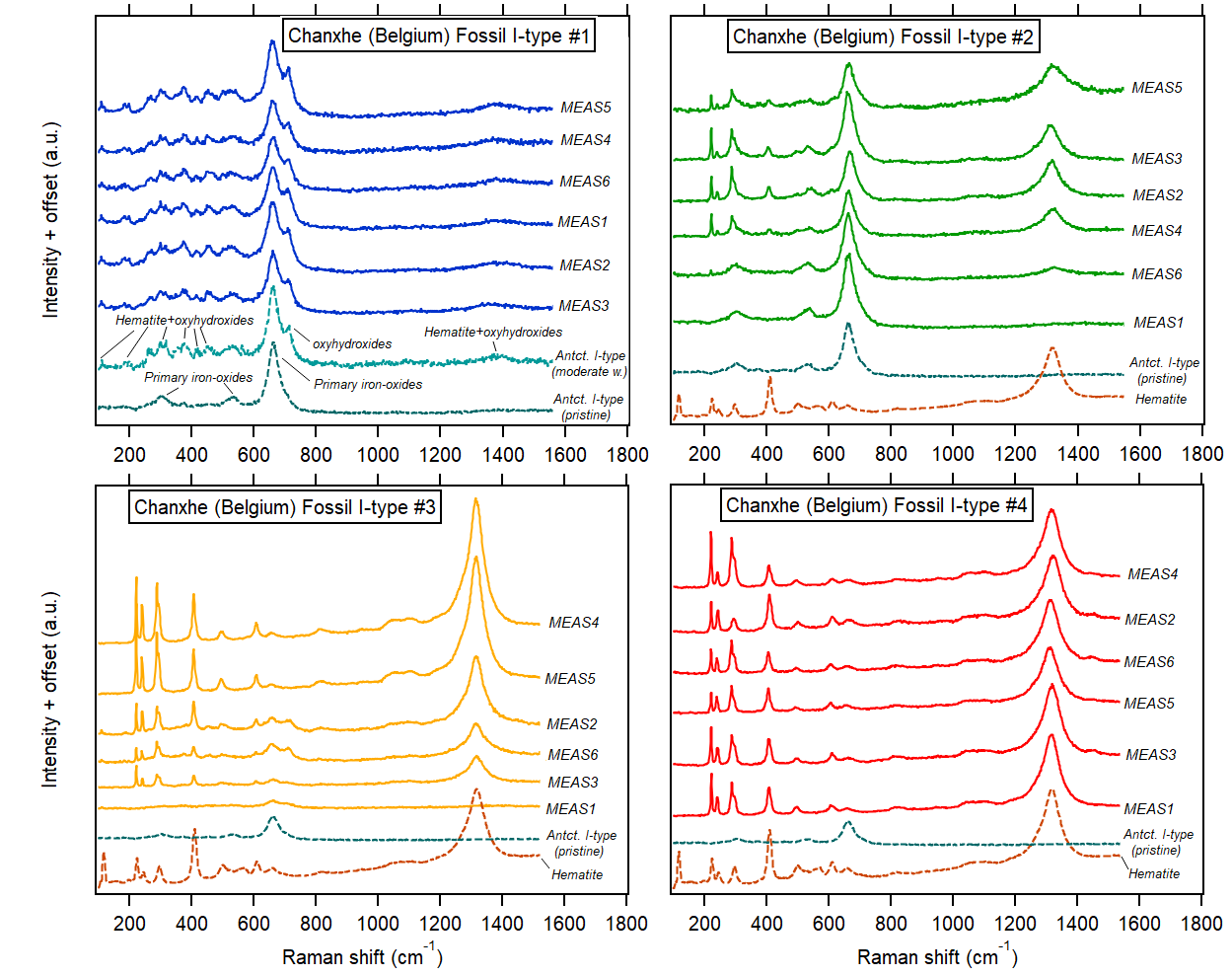 Fig. 1: Compilation of micro-Raman spectra obtained of four fossil I-type cosmic spherules from the late-Devonian Chanxhe (Belgium) collection [8] compared to two modern Antarctic I-types (one pristine and another moderately weathered), plus hematite. “Fossil I-type #1” may potentially be a relatively well-preserved sample based on its spectral similarity with modern Antarctic micrometeorites (e.g. weak hematite/oxyhydroxide-like bands). Note that although Antarctic I-types commonly display spectral evidence of weathering (hematite and/or oxyhydroxides), these bands tend to be significantly weaker than observed in our fossil samples (particularly hematite, as notably seen in Fossil I-types #3 and #4). The Antarctic spherules are from the collections available at the AMGC/VUB and were measured as part of this work. The hematite spectrum was extracted from the RRUFF database (ID: R040024.3). Offset was added for the purpose of clarity.