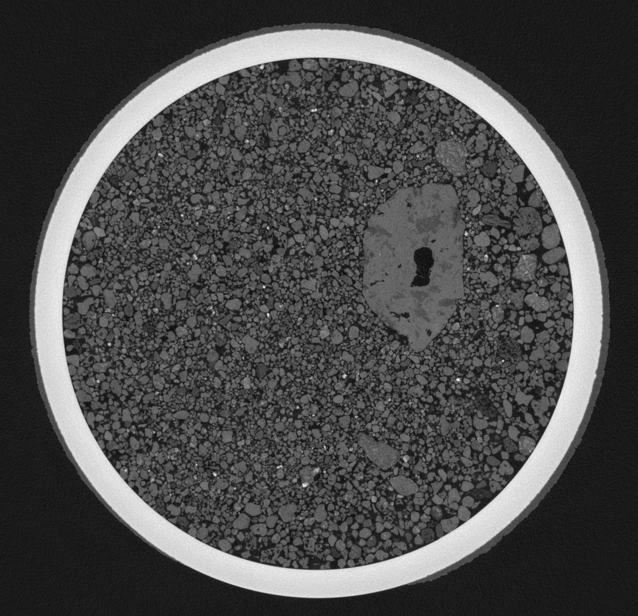Example micro-CT slice of the sample tube with a granular analogue sample, scanned at Ghent University (voxel size: 10 µm)