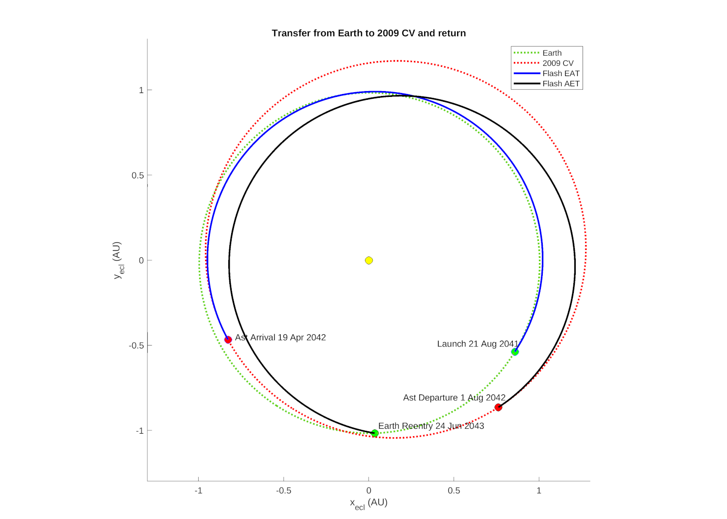 Figure 1: Transfer of PRIAMOS between Earth and 2009CV and back.