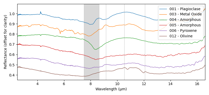 Spectra were analyzed for H2O features including a ~3 µm broad absorption in both MicrOmega and µFTIR data. µFTIR spectra were analyzed for the same HAMP-like absorptions as MicrOmega spectra, as well as spectral features visible at longer wavelengths including at 6.9 μm (N-H) and ~9.5 μm (P-O) [3]. The visible features of grains were analyzed using the LEICA visible microscope imagery.
