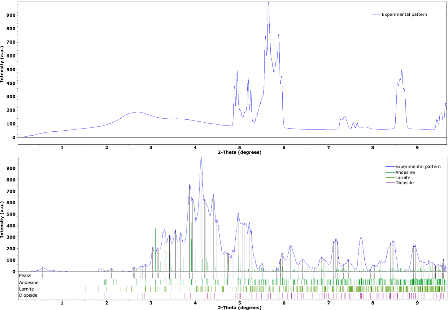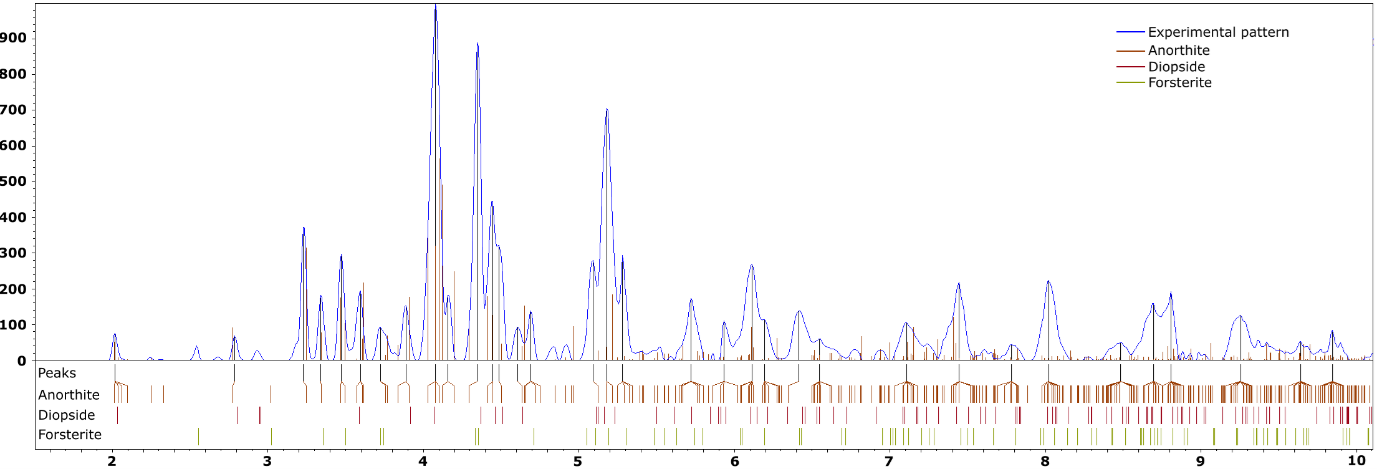 The expected three constituent minerals, plagioclase, pyroxene, olivine, could still be identified, though with differences in atomic site occupancy for two of the phases (andesine, diopside, and larnite compared to the expected anorthite, diopside, and forsterite). The Figure of Merit of the phase matches was reduced: from 0.792, 0.783, and 0.764 for plagioclase, pyroxene, and olivine respectively, to 0.710, 0.670, and 0.705. Estimated quantity also changed from 42.3%, 34.5% and 23.2%, to 34.5%, 25.9% and 39.6%, respectively, though precise quantification is not expected from this semi-quantitative approach and will come from Rietveld refinement.
