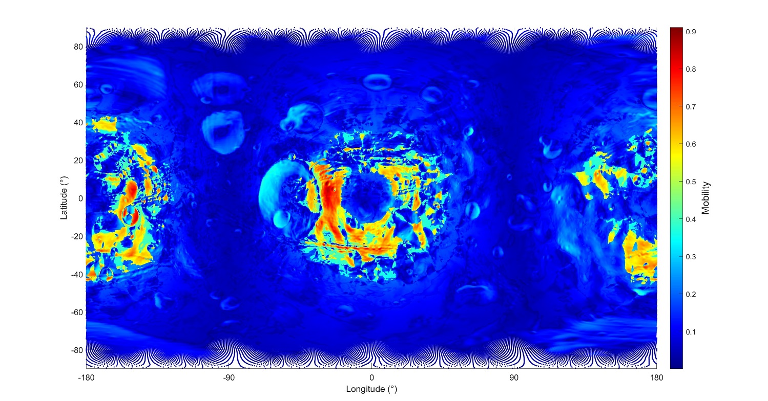 Figure 1. Normalized mobility index across Phobos’ surface, derived from the combination of dynamic slope amplitude, average, and variability along the orbit. The mobility index ranges from 0 (minimum expected material motion) to 1 (maximum susceptibility to regolith displacement).