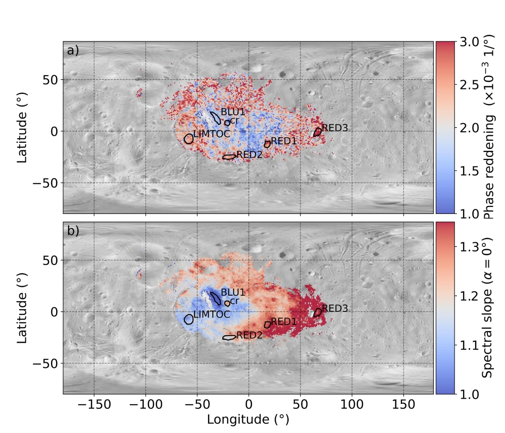 Introduction. The origin of the Martian moons remains a debated topic within the scientific community. Two leading scenarios are commonly considered: the capture of an asteroidal object [1-2] and a giant impact between proto-Mars and a large body [3-5]. The debate arises from the red-sloped spectra, and the primitive and dark appearance of Phobos [6-15], resembling a D-, P- or T-type asteroid [16]. This is contradicted by the orbital parameters [17], the MIR/TIR spectra [18-20] and a possible presence of a 1 µm absorption [6], all suggesting an impact origin. Another debated topic is Phobos’ color dichotomy that characterizes the satellite surface, first described by [6]. The blue unit is associated to the eastern rim of Stickney crater (9 km across), while the red unit characterizes the rest of the surface. The blue unit has a higher reflectance in the VIS [21]. Since the latter is prominent near the impact site, it is hypothesized to consist of ejected material from Stickney. In contrast, the red unit is an older, space weathered material.