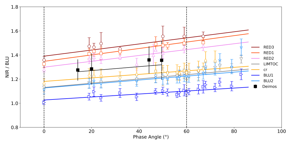 Comparison to the meteorite samples and deposited olivine and FeS mixtures is most consistent with the deposited Allende large grains sizes sample (sieved to <500 microns) for both the small and large phase angles. While other samples appear very close such as Orgueil or the Olivine and FeS mixtures, their negative branch characteristics (Pmin and P0 values) are inconsistent with the ones observed for Deimos.