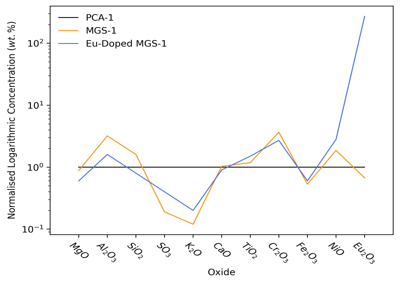 Raman microscopy resolves all phases under spatial resolution below 20-30 µm in the impact craters and around. Averaging spectra across 50-100 µm size areas (the sampling size range of the RAX instrument [2]) can result in reduction of Raman signal contrast at locations with multiple phases, particularly if these are poorly represented or exhibit strong luminescence (Fig. 3).