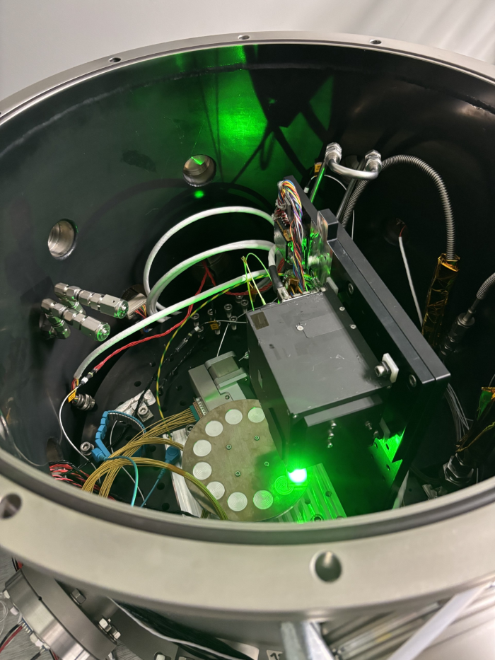 Figure 1: Top: Thermal vacuum chamber into which the RAX DM was integrated. Bottom: The RAX DM is facing downwards to measure reference samples placed on a rotating sample holder