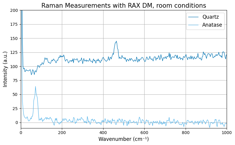 Figure 2: First light data of quartz and anatase measured using the RAX DM in the reference setup at ambient conditions. Data acquisition parameters need yet to be optimized.