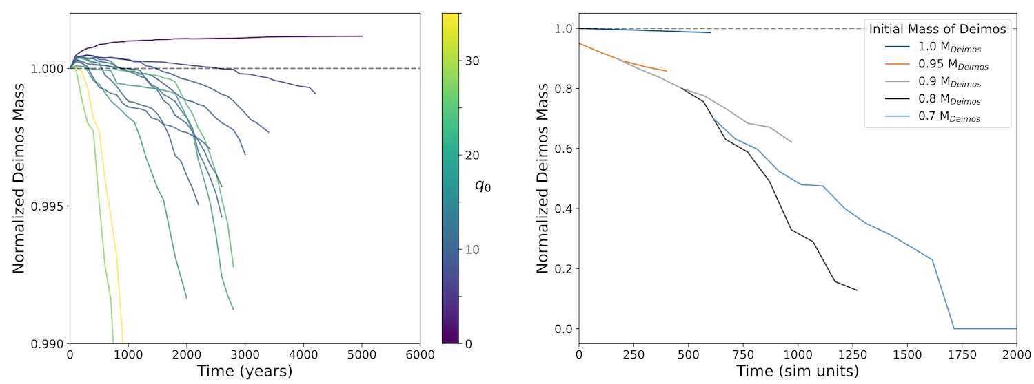 Figure 1: Deimos’ mass loss due to sesquinary impacts. (a) Mass loss across multiple initial orbital excitations q. Impactor Rinitial∼100−200 m. (b) Accelerated mass loss for Deimos at q∼23 with lower starting mass and bigger impactors. We see consistent mass loss in both sests of simulations.
