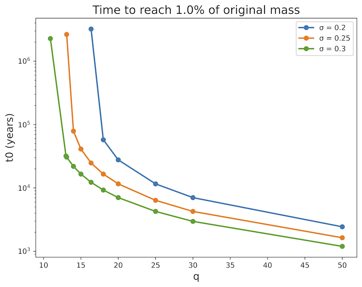 Figure 2: Time taken to breakup a Deimos-like satellite to 1% of it’s original mass via the sesquinary catastrophe.