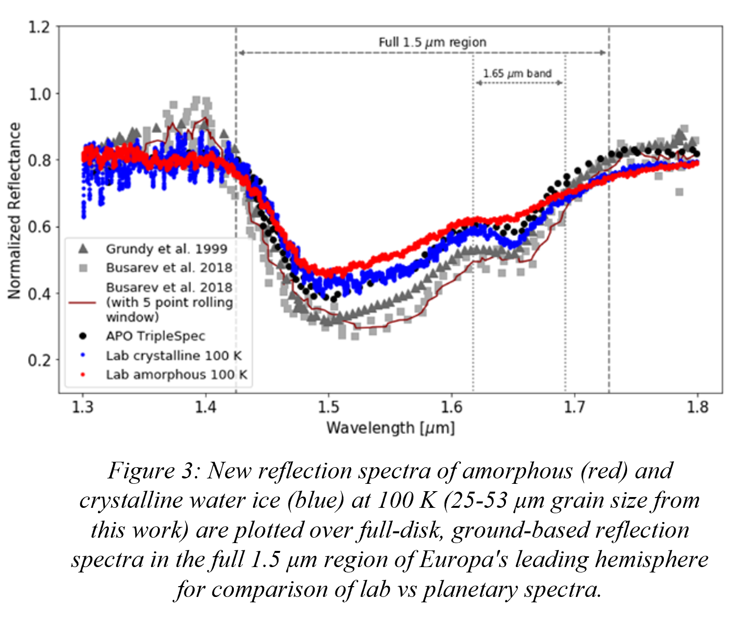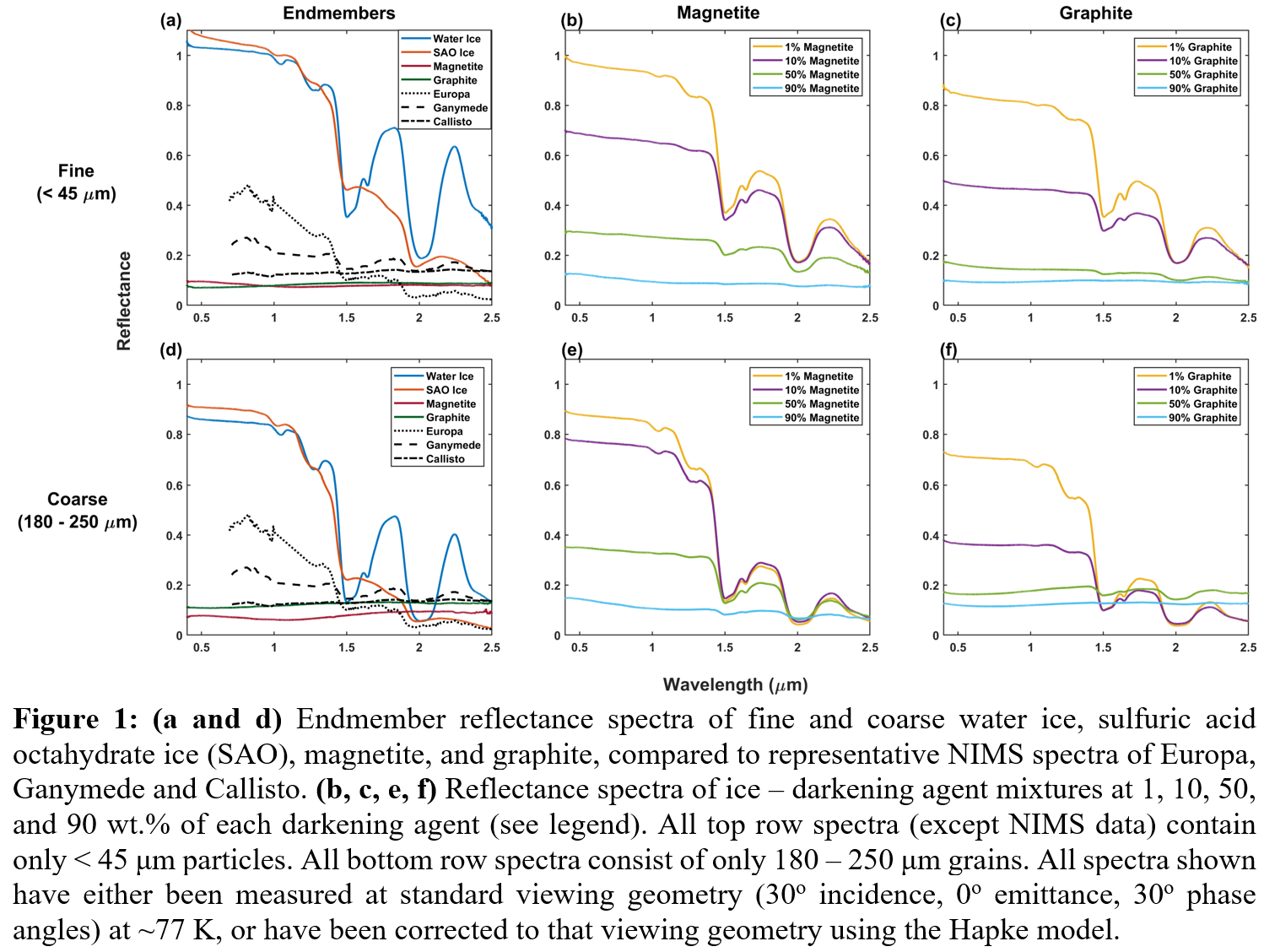Darkening agent abundances are reportedly <20%, ~50%, and ~90% for Europa [4], Ganymede [5,6] and Callisto [7], respectively; however, large uncertainties are present in these estimates. These moons’ surfaces are likely intimately mixed due to space weathering and potential endogenic activity. A few wt.% darkening agent when intimately mixed with bright materials can drastically reduce the overall mixture’s reflectance [8]. Previous darkening agent abundances [4-7] are influenced by more than physically present species. They are sensitive to particle size effects and act as free variables for unknown surface materials. Due to this, our understanding of these moons’ surfaces and therefore the processes happening on and within them may be inaccurate.