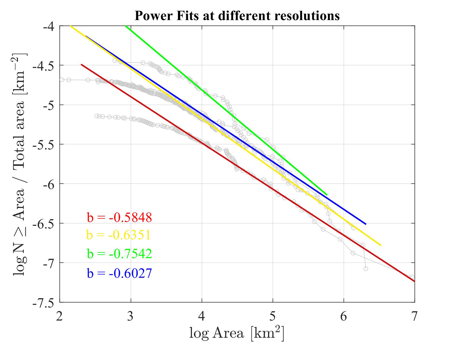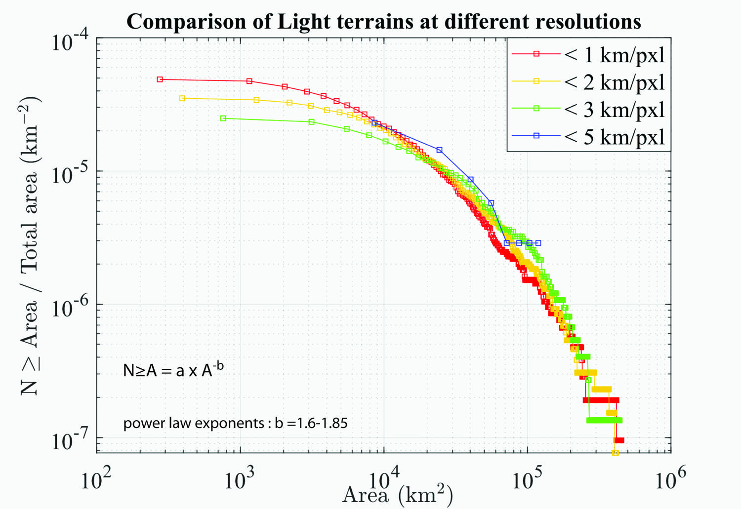 We used Ganymede´s global remote sensing mosaic published by Kresten et al. (2022). This mosaic is composed of Voyager, Galileo, and Juno imageries with different resolutions, ranging from <1km/pxl to 5km/pxl (Kresten et al. 2021). Collins et al. (2013) mapped the blocks of DT and LT as polygones, available in a GIS format. We used this data set and analyzed the size-frequency distribution of these blocks, separated for LT and DT. There are many small polygones, and fewer large ones, and this relationship is visualized by plotting the number of blocks larger than a given size against the area itself on a log-log scale. Using cumulative fragment area-frequency diagrams we fitted power-laws with an exponent -b, if the distributions follow linear regressions in the double logarithmic space. A power law distribution indicates a scale-invariant behavior.