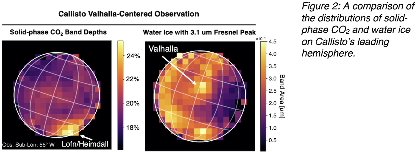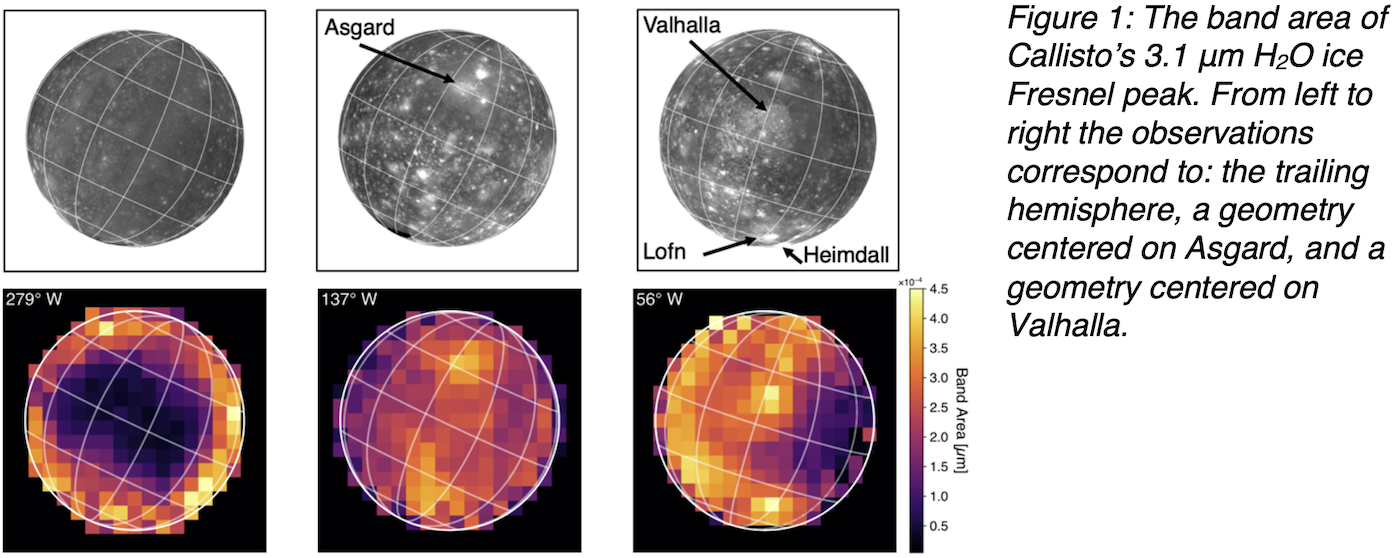 Mixture results additionally highlight the overall plausibility of some darkening agents. For example, fine and coarse magnetite abundances need to be near 90 wt.% to match Callisto’s surface in some regions. Our mixtures may be spectrally similar to the Callisto spectrum; however, this is likely not representative of Callisto’s actual surface composition. The main avenue by which magnetite, or any Fe-rich material, can be delivered to Callisto’s surface is through (micro)meteorite impacts. A significant flux of Fe-rich impactors needed to have been present near Callisto to provide this amount. Graphite or C-bearing materials are more feasible. They can be delivered via (micro)meteorite bombardment, produced through radiolytic breakdown of surface C materials like CO2, or may also be sourced endogenically like on Europa, where CO2 signatures are linked to chaos terrain [10].