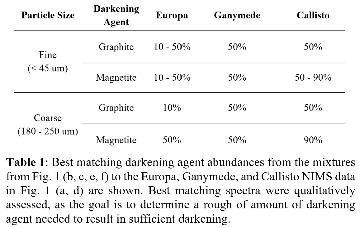 Definitive statements about upper and lower limits of darkening agents through comparisons between NIMS data and lab mixtures (Table 1) are difficult to make. The surfaces of these bodies are undoubtedly more complex than simple three-component mixtures. However, we can still draw rough conclusions based on darkening agent abundances that give similar reflectance levels, despite not being able to match features perfectly.
