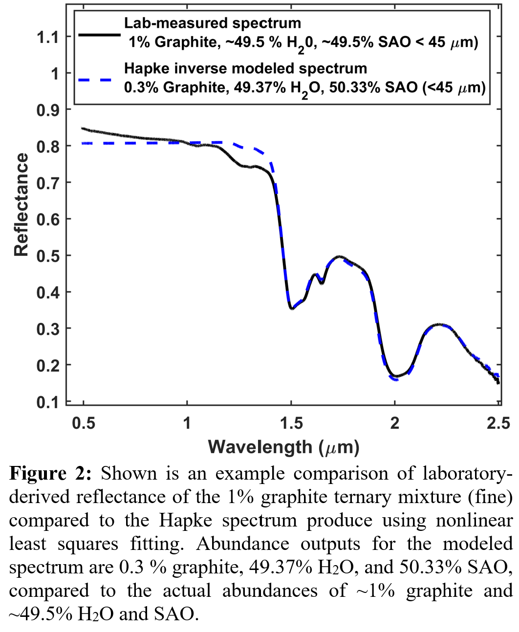 Hapke radiative transfer modeling [9] was used to produce spectra of each mixture to investigate model accuracy and limitations. Figure 2 shows a comparison of the 1 wt.% fine graphite mixture to a modeled spectrum produced by a nonlinear least square fitting algorithm to the Hapke reflectance equation. The best-fitting model spectrum used 0.3% graphite (45 μm), 49.37% water (36 μm), and 50.33% sulfuric acid octahydrate (45 μm).