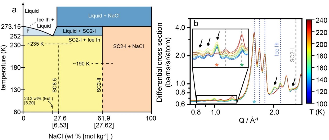 Figure 1. (a) Updated phase diagram of the low-temperature NaCl-H2O system incorporating phase behavior of high-pressure hydrate 2NaCl·17H2O (SC8.5 [6]) and proposed metastable dihydrate (SC2-II, this study, [5]). Dashed lines indicate observed metastable transition temperatures to hydrohalite (SC2-I) and ice Ih. (b) Neutron diffraction patterns for a flash frozen sample that has been heated. Bragg peaks for the new NaCl hydrate are marked with arrows, while Bragg peaks for hydrohalite (SC2-I) and ice Ih are marked with dashed lines (reproduced from [5]).