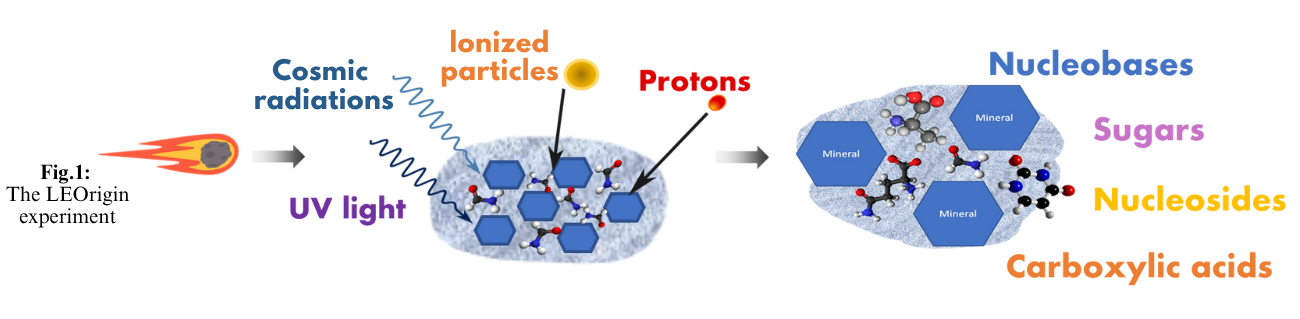 The experiment focuses on the conversion of formamide [1] – a simple, one-carbon molecule found throughout the Universe (interstellar medium, comets, and protoplanetary disks) – triggered by energetic UV and cosmic radiations catalyzed by asteroid-, meteorite- and comet-like minerals, in space environment conditions, see (Fig. 1).