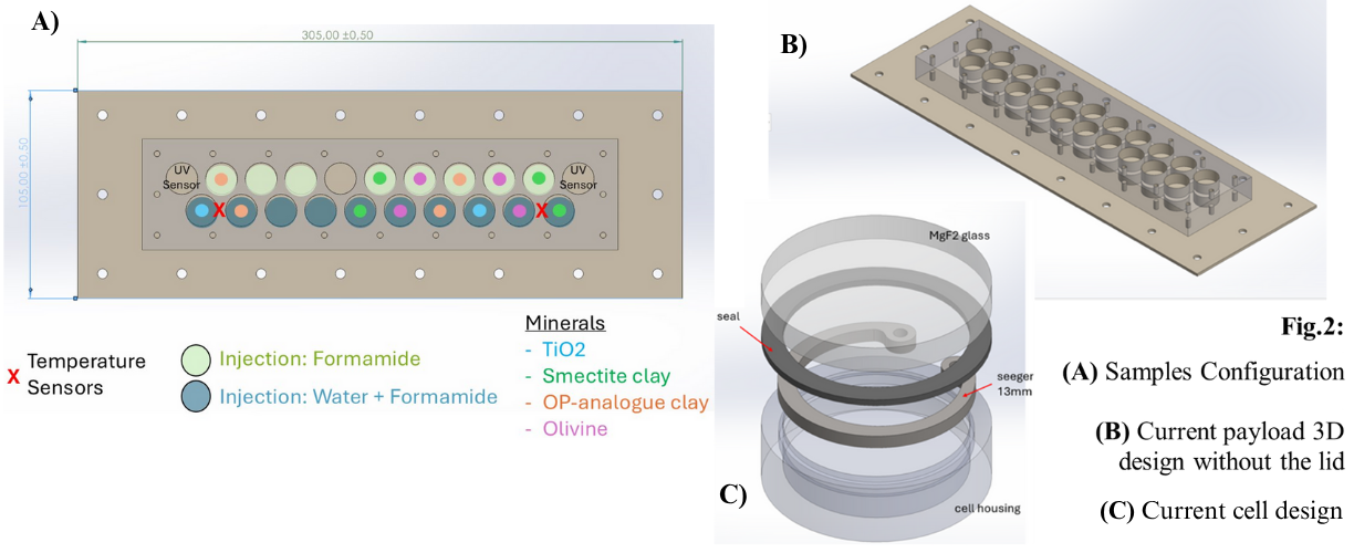 The payload is composed of 42 cells (Fig. 2 A&B) divided into two superimposed stacks. Each stack consists of 14 pelletized minerals injected with formamide or formamide+water; 4 control cells containing only formamide or formamide+water; and 3 cell spots for UV and thermal sensors. The top stack will be exposed to UV light while the second will serve as dark control. The cell windows are made from MgF2, which is transparent to UV light and the cell housing is chosen such that no interference with the formamide condensation is expected (Fig. 2C). Top cells will be exposed to solar and cosmic radiations when Space Rider Cargo Bay doors open.