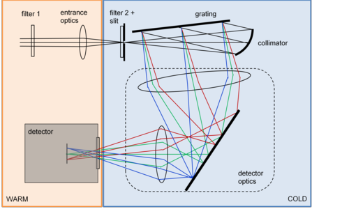 The cold spectrometer section is preceded by a warmer band selection section. It is a combination of a filter wheel and a butcher’s block of two horizontal filters (on top of the spectrometer entrance slit).