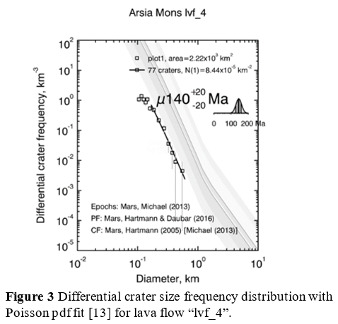 Discussion and perspectives: The obtained ages span 150 million years, with an apparent peak age at 150 Ma. This age corelates with the 150 Ma peak eruption age within the caldera [4]. It has been argued that a transition from explosive to effusive style occurred at Arsia Mons 200 Myrs ago [4]. Our results confirm that after effusive volcanism resumed, volcanic activity at Arsia Mons was not restricted to the caldera. Activity centered at the caldera and the southern flank followed a several hundred million years hiatus after main-flank building activity already noted by previous studies [3,4]. Crosscutting relationships between lava flows and bounding faults of concentric grabens indicate that extensional tectonics was coeval with some of the eruptions.