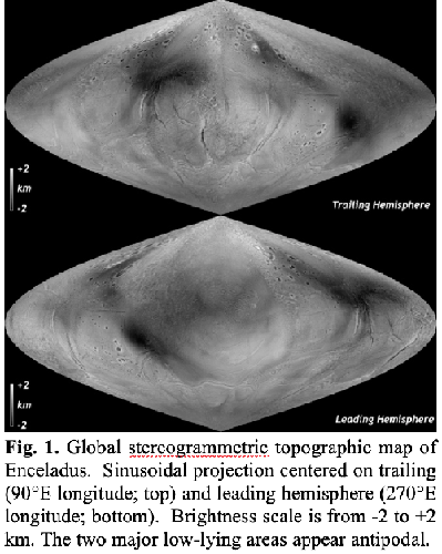 Stereogrammetric digital elevation models (DEMs) of Enceladus were constructed from Cassini stereo pairs and mosaics using the same software used to map the topography of Pluto, Charon, and other icy bodies [6]. As each stereo pairing has a unique stereo geometry, the vertical precision (or uncertainty) is variable across Enceladus and ranges from <50 to ~300 m. Hence while most DEMs resolve geologic features, a few do not. The individual stereo-DEMs are assembled into a global DEM (Fig. 1) by minimizing the difference to our (coarser but coincident) map of 4591 match point radii values. Our new map shows topography relative to the triaxial ellipsoid of [2]. Here we focus on global and regional variations and defer analyses of geologic features.