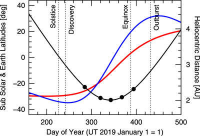 Figure 3: Subsolar (red) and sub-Earth (blue) latitude of 2I/Borisov as a function of time, together with the heliocentric distance (black solid line) on the right axis. We assumed a rotation pole orientation of R.A. = 205 deg and decl. = 52 deg.