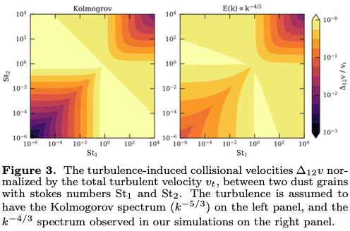 The deviation from the standard picture of the Kolmogorov turbulence can have a significant impact on the grain collisional velocities. Figure 3 shows the collisional velocities in Kolmogorov turbulence and turbulence observed in the simulations. For small grains that are well coupled to the gas, the collisional velocities can vary by orders of magnitude across different turbulence models. To understand the dust growth in protoplanetary disks, better computational techniques are needed to achieve the large dynamical range necessary for resolving the turbulence spectrum in the future.