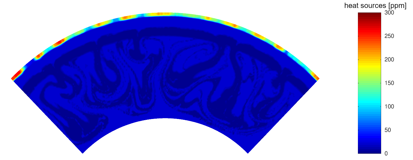 Fig. 2: Redistributed amount of the joint heat sources 40K, 232Th, and 238U on Mars after 600 Myrs.